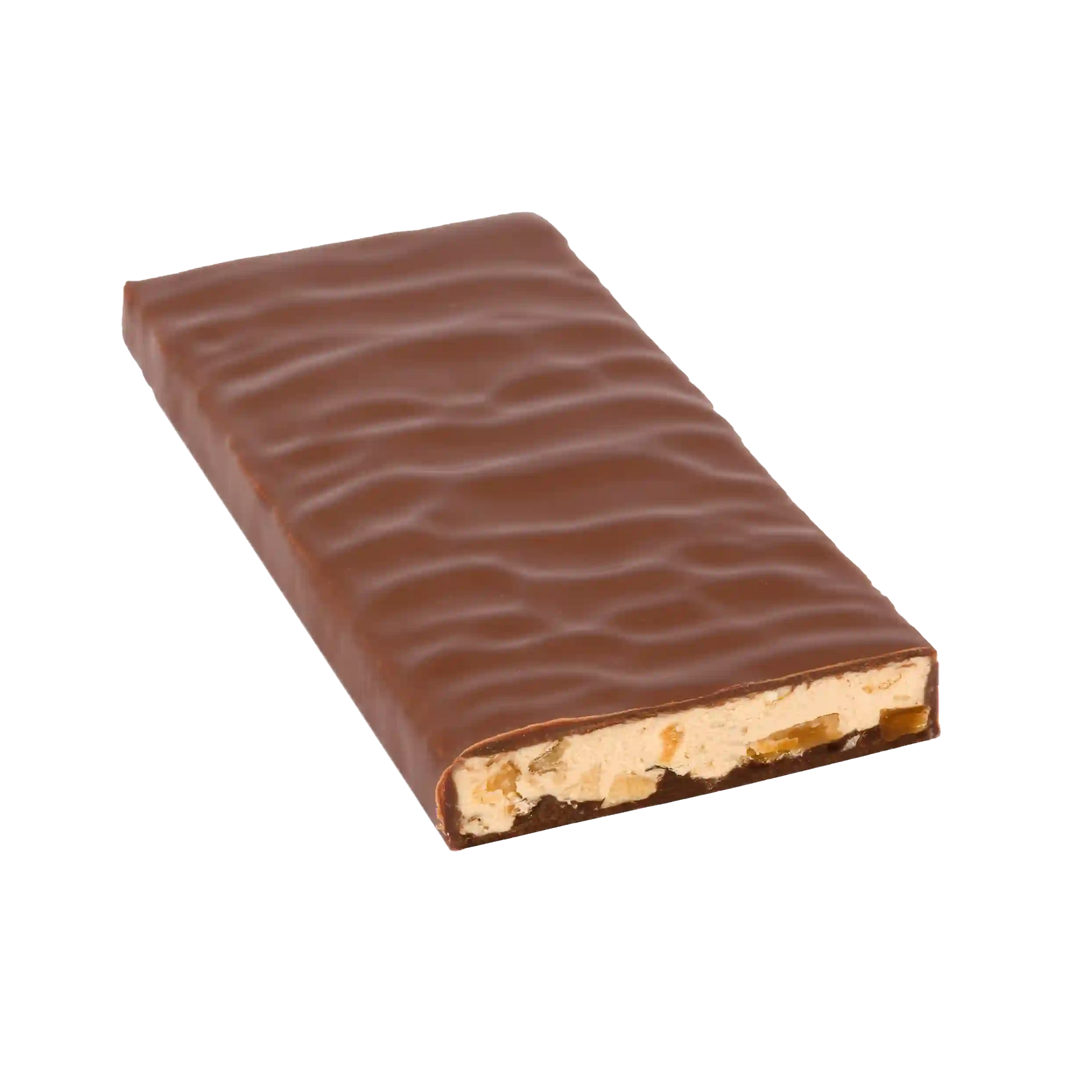 Frisch vom Christkindlmarkt mit gebrannten Mandeln: Ein selbstgemachter Mandelnougat mit gebrannten, karamellisierten Mandelstückchen in einer dunklen Milchschokolade mit 50 % Kakaoanteil fährt mit all den süßen und nussigen Geschmackserinnerungen aus der Kindheit Karussell.